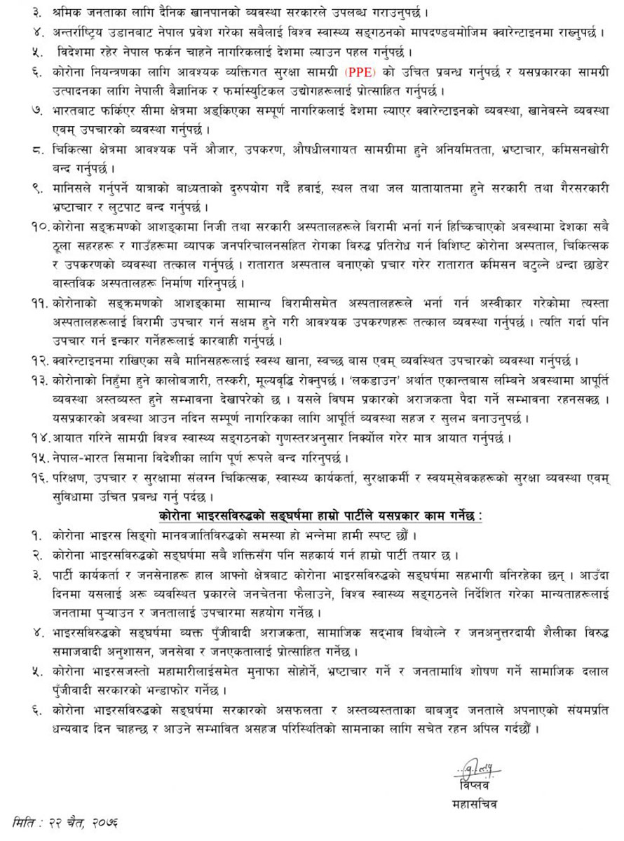 नेपालमा कोरोना संक्रमितको संख्या ९ पुगिसकेका बेला नेकपाका महासचिव विप्लवले शनिबार विज्ञप्ति जारी गरेर सर्वसाधारण नागरिकका लागि सरकारले स्वास्थ्य परीक्षणको सुविधा गाउँगाउँमा उपलब्ध गराउनु पर्ने बताएको हो ।