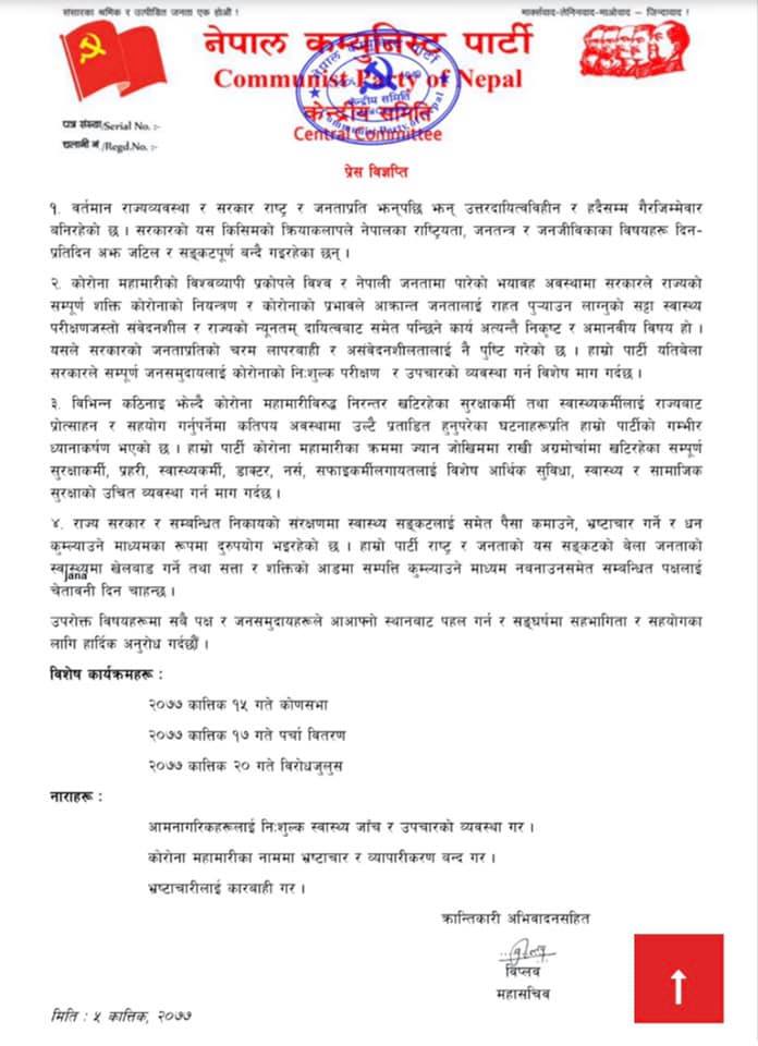 पार्टी महासचिव विप्लवले बुधबार एक विज्ञप्ति जारी गर्दै कोरोना भाइरसको महामारीले त्रासमा रहेका जनताको उपचारमा सरकारले कोरोना महामारीले आक्रान्त बनेका जनतामा सरकारले राज्यको सम्पूर्ण शक्ति कोरोना नियन्त्रण र जनतालाई राहत पुर्याउन लाग्नुको सट्टामा स्वास्थ्य परीक्षण जस्तो संवेदनशील विषय र राज्यको न्यूनतम दायित्वबाट समेत पन्छिने कार्य अत्यन्तै निकृष्ट र अमानवीय भएको बताएका छन् ।