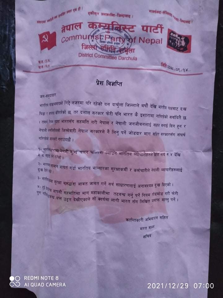 एसएसबीले हाल भारतीय क्षेत्रमा प्रवेश गर्ने नेपालीको नागरिकता तथा खोपकार्ड माग्ने गरेका छन् । नाम, नागरिकता नम्बर, बुबाको नाम लगायतका व्यक्तिगत विवरण राखेर एसएसबीले धार्चुला प्रवेश दिने गरेको छ । लाइन लगाएर नेपाली नागरिकको खानतलास गर्नु एसएसबीको दुःख दिने नियत मात्रै भएको नेकपा दार्चुलाका सदस्य भुवन जोशीले बताए ।