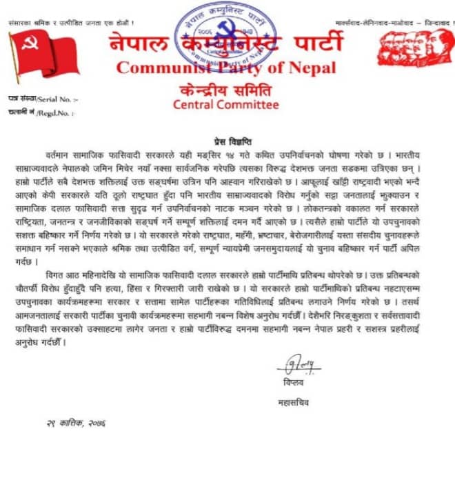 महासचिव विप्लवले जारी गरेको विज्ञप्तिमा केपी ओली सरकारले घोषणा गरेको उपचुनावलाई सशक्त बहिष्कार गर्ने निर्णय गरिएको उल्लेख छ ।