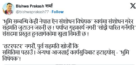 शर्माले भूमि ऐन जस्तो संवेदनशील विषयमा व्यापक संवाद र सहमति अनिवार्य रहेको उल्लेख गर्दै, चाँडो निष्कर्षमा पुग्न हतार नगर्न सरकारलाई आग्रह गरे।