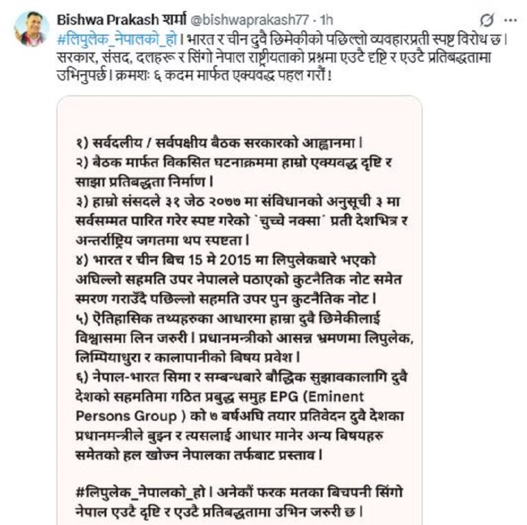 ‘‘लिपुलेक नेपालको हो । भारत र चीन दुवै छिमेकीको पछिल्लो व्यवहारप्रति स्पष्ट विरोध छ,’ महामन्त्री शर्माले एक्समा लेखेका छन्, ‘सरकार, संसद्, दलहरू र सिंगो नेपाल राष्ट्रियताको प्रश्नमा एउटै दृष्टि र एउटै प्रतिबद्धतामा उभिनुपर्छ । क्रमशः ६ कदममार्फत ऐक्यबद्ध पहल गरौँ ।’
