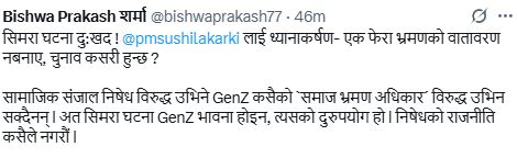 ‘सिमरा घटना दुःखद प्रधानमन्त्री सुशीला कार्कीलाई ध्यानाकर्षण,’ विश्वप्रकाशले प्रधानमन्त्रीलाई मेन्सन गर्दै लेखेका छन्, ‘एकफेरा भ्रमणको वातावरण नबनाए चुनाव कसरी हुन्छ ?’