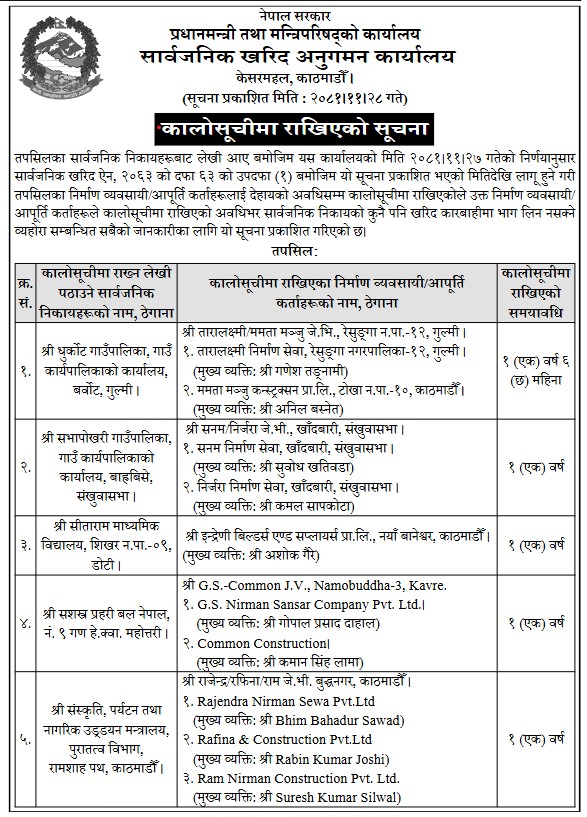 त्यस्तै, संस्कृति, पर्यटन तथा नागरिक उड्डयन मन्त्रालयले सिफारिस गरेको राजेन्द्र निर्माण, काठमाडौं पनि कालोसूचीमा परेको छ। कार्यालयले यी कम्पनीहरूलाई सार्वजनिक खरिद ऐन, २०६३ अनुसार कारबाही गरेको जनाएको छ।