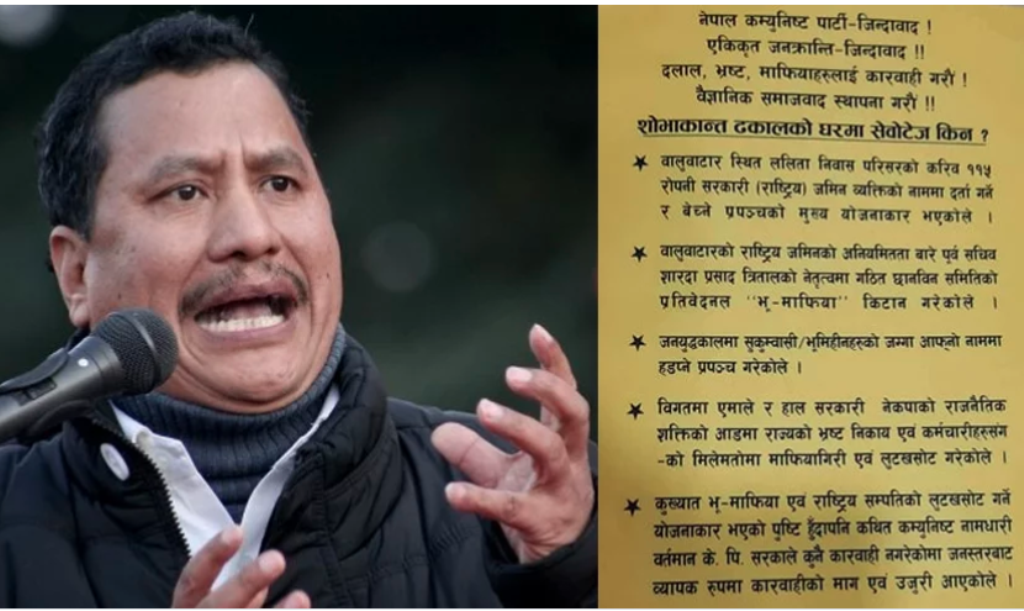 ‘बालुवाटारस्थित ललिता निवासको जग्गा माफियाका नाइकेहरु भाटभटेनी सुपरमार्केटका मालिक मीनबहादुर गुरुङ, भू-माफियाहरु शोभाकान्त ढकाल र रामकुमार सुवेदीको चंगुलमा परेर राज्य सञ्चालकले सुवर्ण शम्शेरको सन्तानबाट तथाकथित मोही सिर्जना गरेको हो’, पर्चामा लेखिएको छ।