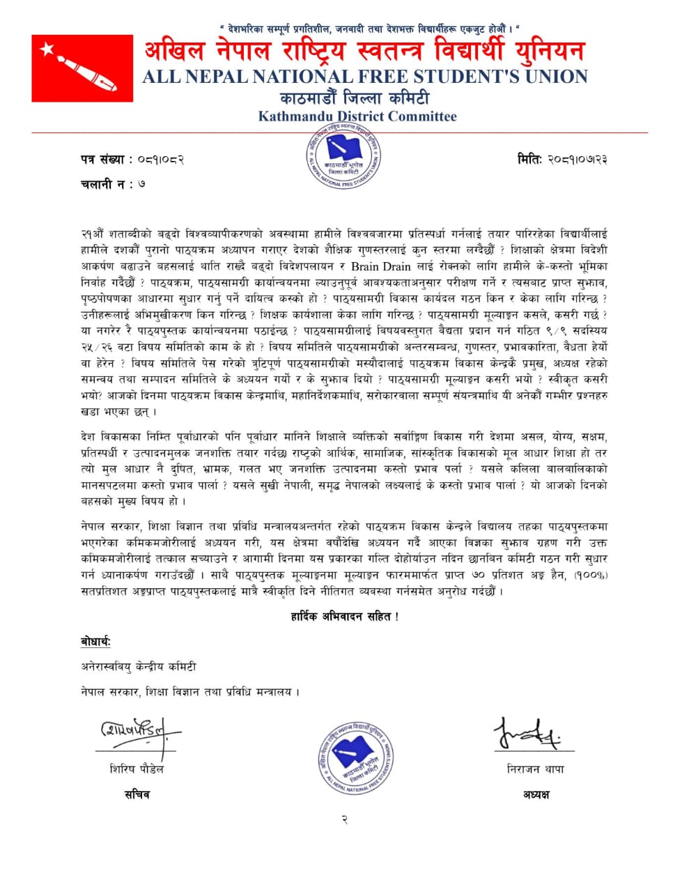 पाठ्यपुस्तकमा रहेका त्रुटि सच्याउन अनेरास्ववियुको ध्यानाकर्षण