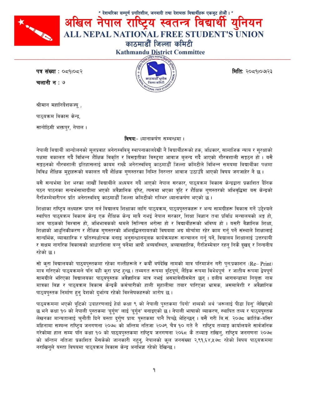 अनेरास्ववियु काठमाण्डु जिल्ला कमिटीका इन्चार्ज धर्मराज तिमल्सिनाको नेतृत्वमा गएको टोलीले तत्काल पाठ्यपुस्तकमा रहेका गल्ती सच्याउन ध्यानाकर्षण गराएको छ । पाठ्यक्रम विकास केन्द्रले ७७ वटै जिल्लाका ३५ हजार ६७४ भन्दा बढी विद्यालयमा गलत शिक्षा पढ्न बाध्य पारेर राज्यको लगानीमाथि गम्भीर घात गरेको, अभिभावकका सपना कुल्चिने दुष्प्रयास गरेको र विद्यार्थीको भविष्यसँग खेलबाड गरेको अनेरास्ववियुले ठहर गरेको छ ।