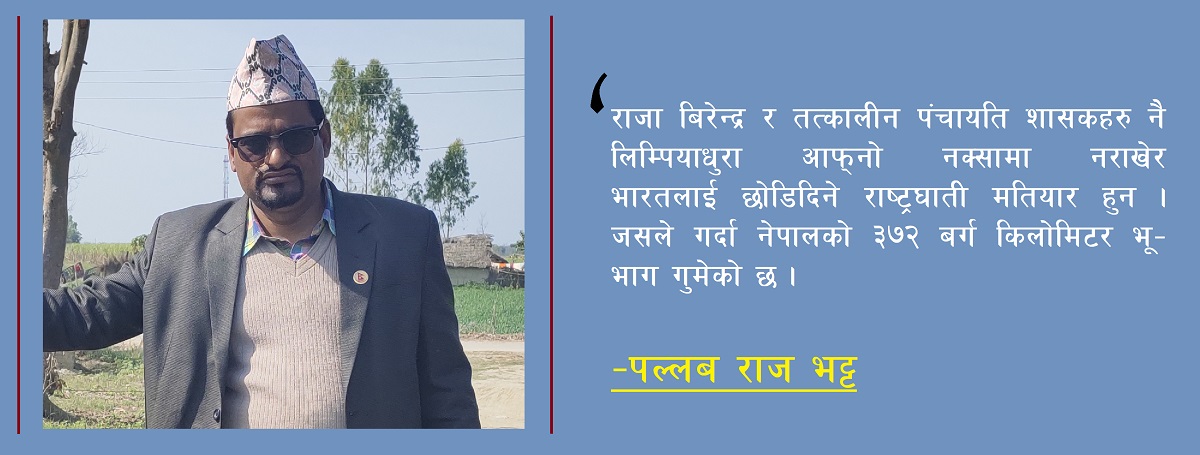 मन्त्रीले त्यसो बोल्न हुन्थ्यो या हुँदैन थियो तर यो सत्य हो की आज सम्म नेपालले स्वीकार गरेको वा निमार्ण गरेको आफ्नो नक्सामा लिम्पियाधुरा छैन । त्यती मात्र होइन नेपालको क्षेत्रफल भित्र लिपुलेक देखि लिम्पियाधुराबाट निस्किने कुटीयाङदी बग्दै आएर कौवाखोलामा मिसिने ठाउँ सम्मको क्षेत्रफल समेत नेपालको क्षेत्रफलमा गणना गरिएको छैन । राजा महेन्द्र र उनका छोरा बिरेन्द्रले गरेको गद्दारीका कारण गुमेको यो क्षेत्र राखेर नक्सा जारी गर्न सके नेपालको इतिहासमा हाल सम्मको सबैभन्दा ठुलो राष्ट्रवादी काम हुनेछ र गुमेको भूमि फिर्ता अभियानको आधार तयार हुनेछ । यो अवसर नेपाल कम्युनिष्ट पार्टी (नेकपा)को केपि ओली नेतृत्वको सरकार एवं त्यसका परराष्ट्र मन्त्री प्रदिप ज्ञवाली र भूमि ब्यवस्था मन्त्री पद्यमा अर्यालले प्राप्त गर्नु भएको छ, यो पार्टी र आफ्नो नाम नेपालको इतिहासमा स्वर्णिम अक्षरले लेखाउने महान अवसर हो । यो अवसर नगुमाउनुहोस् ।