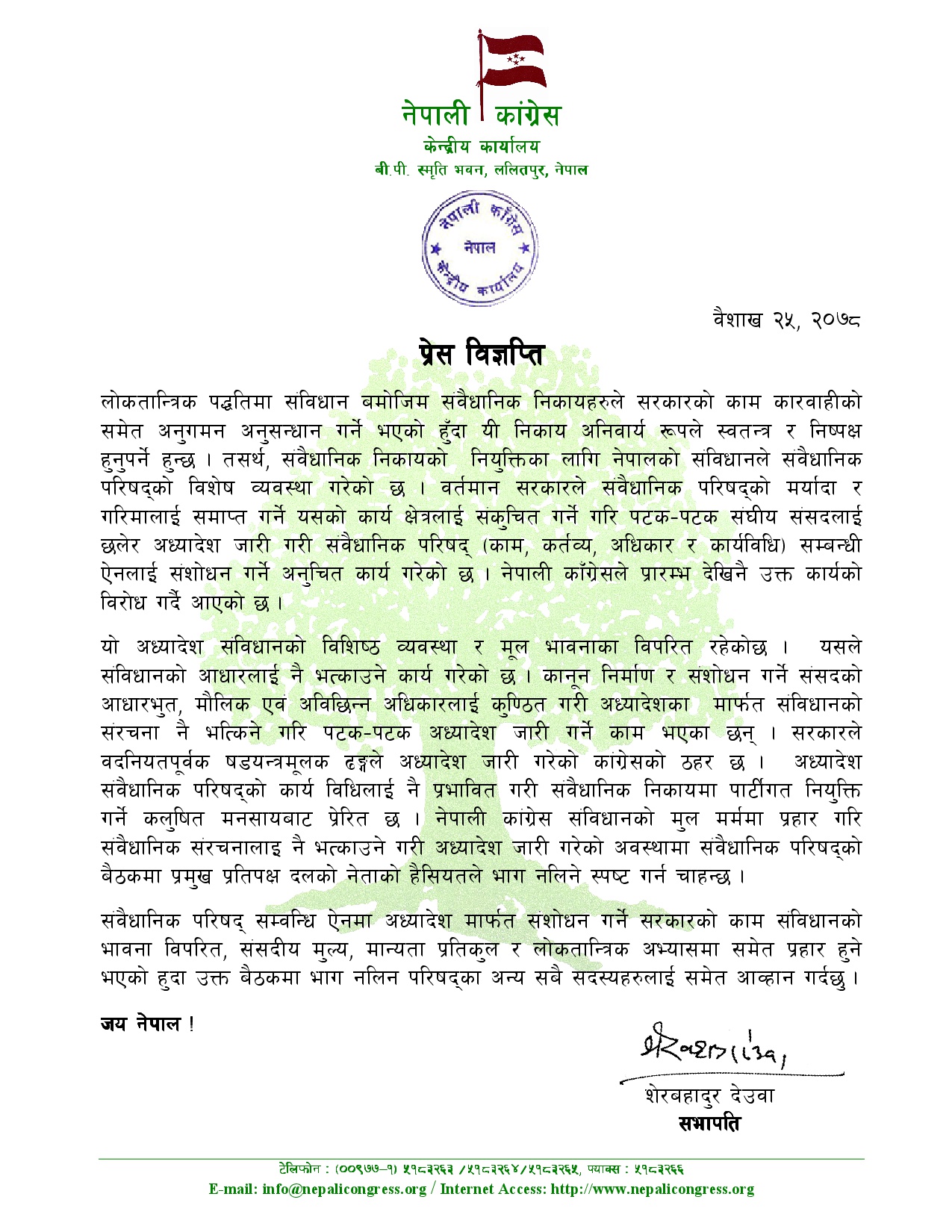 सरकारले संविधानको मुल मर्ममा प्रहार गरि संवैधानिक संरचनालाई नै भत्काउने गरी अध्यादेश ल्याएको अवस्थामा संवैधानिक परिषद्को बैठकमा प्रमुख प्रतिपक्ष दलको नेताको हैसियतले आफू सहभागी नहुने घोषणा गरेका हुन् । उनले परिषद्का अन्य सबै सदस्यहरुलाई समेत बैठकमा सहभागी नहुन आग्रह गरेका छन् ।