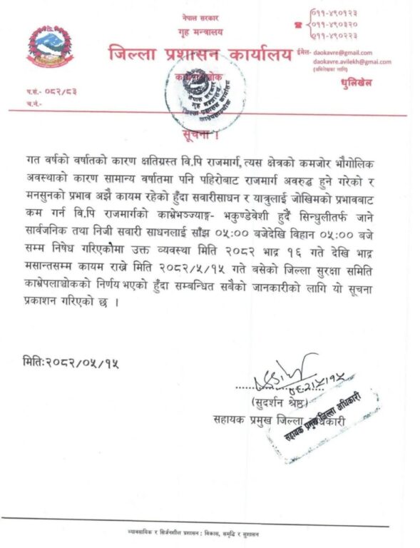 जिल्ला सुरक्षा समिति काभ्रेको बैठकले बीपी राजमार्गको काभ्रेभञ्ज्याङ–भकुण्डेवेशी हुँदै सिन्धुलीतर्फ जाने सार्वजनिक तथा निजी सवारीसाधनलाई साँझ ५ बजेदेखि बिहान ५ बजेसम्म सञ्चालनमा रोक लगाउने निर्णय गरेको छ ।