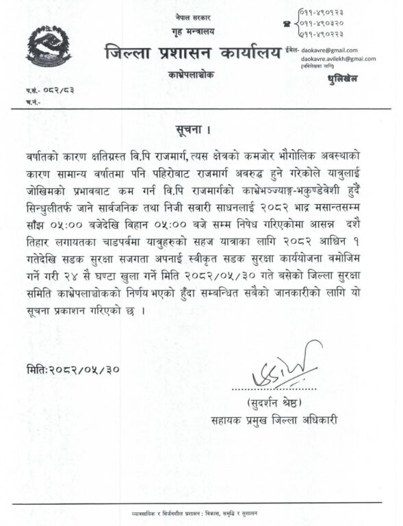 जिल्ला प्रशासन कार्यालय काभ्रेपलाञ्चोकले सार्वजनिक गरेको सूचनाअनुसार असोज १ गते बुधबारदेखि राजमार्ग खुला गरिने भएको हो ।