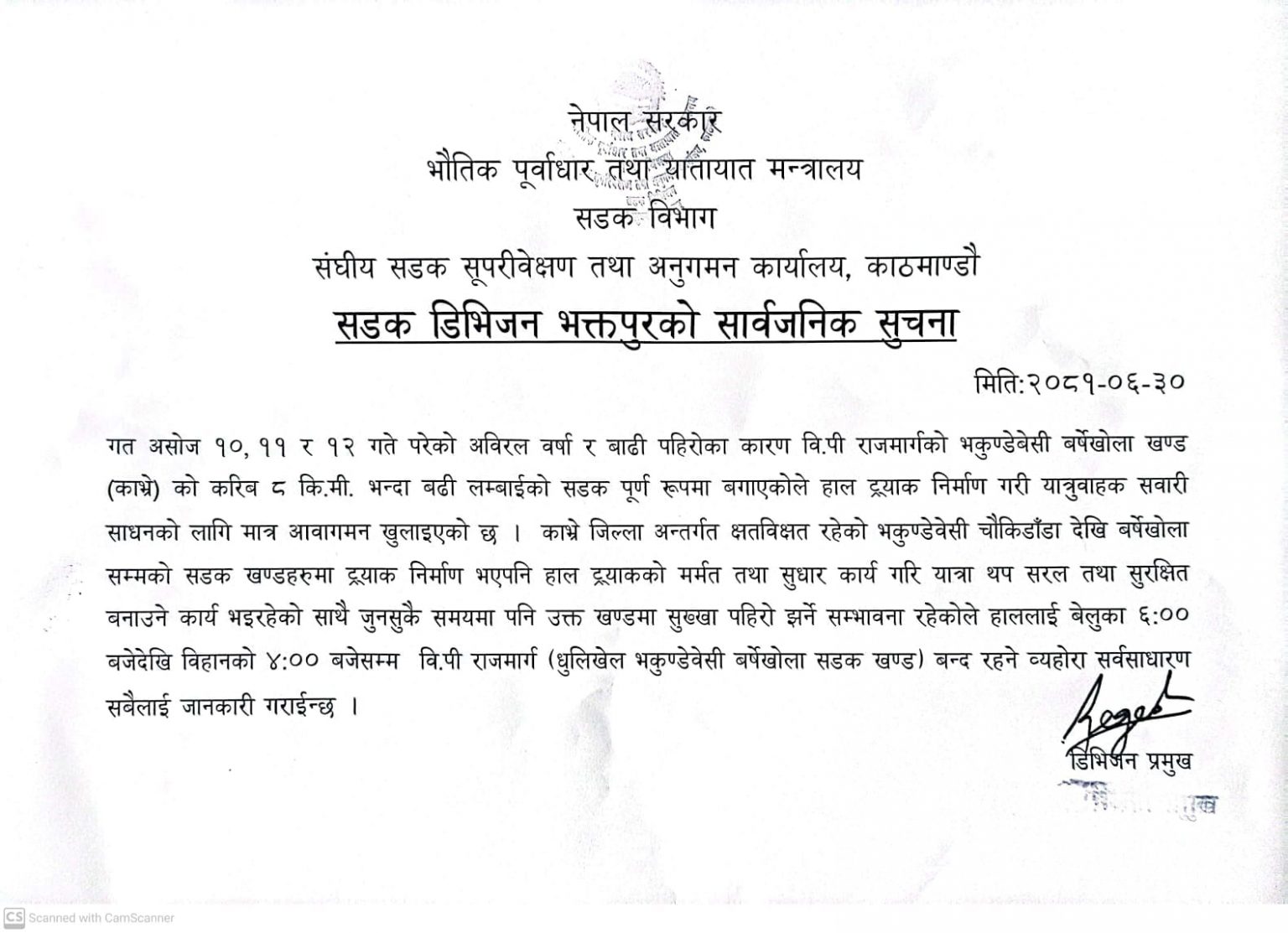 संघीय सडक सुपरिवेक्षण तथा अनुगमन कार्यालय काठमाडौँ मातहतको सडक डिभिजन खाल्टेले बुधबार एक सूचना जारी गर्दै ट्र्याकको मर्मत तथा स्तरोन्नति कार्य गरी यात्रा थप सरल तथा सुरक्षित बनाउने कार्य भइरहेकाले हाललाई बेलुका ६ बजे देखि बिहानको ५ बजेसम्म सो सडक खण्ड बन्द रहने जनाएको हो ।
