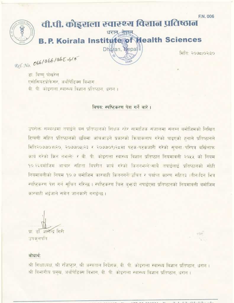 उपकुलपति डा.ज्ञानेन्द्र गिरीले मेडिकल एवं डेन्टल फ्याकल्टी वेलफेयर सोसाइटीका अध्यक्ष डा.विष्णु पोखरेललाई स्पष्टीकरण सोधेको विषय लगायत अन्य २ बुँदे माग राख्दै आजदेखि आन्दोलन सुरु भएको हो ।