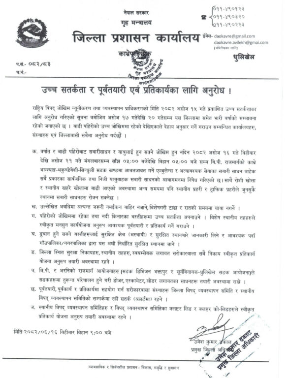 जिल्ला प्रशासन कार्यालय काभ्रेले बिहीबार सूचना जारी गरी असोज १६ गते बिहीबारदेखि २१ गते मंगलबारसम्म साँझ ५ बजेदेखि बिहान ५ बजेसम्म बीपी राजमार्गको काभ्रे भञ्ज्याङ–भकुण्डेबेंसी–सिन्धुली सडकखण्डमा एम्बुलेन्स र अत्यावश्यक सेवाका बाहेक सबै प्रकारका सार्वजनिक तथा निजी सवारीसाधन आवागमन निषेध गरिएको जानकारी दिएको छ ।