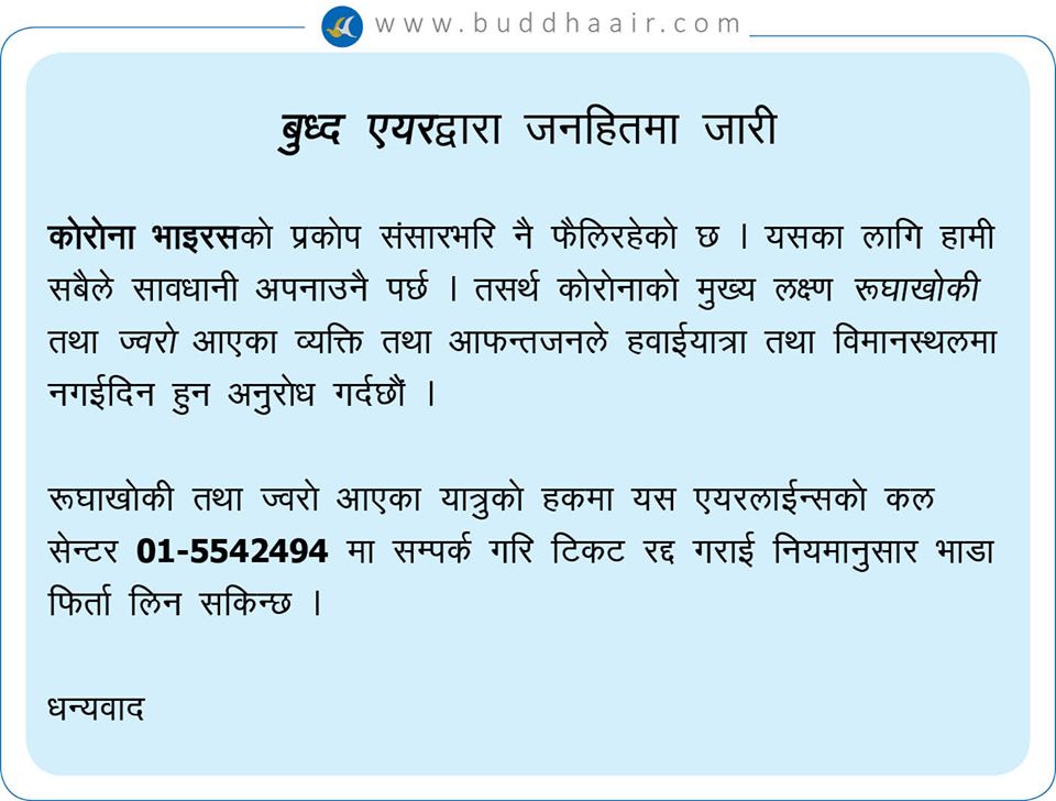 कम्पनीले आफ्नो आधिकारिक फेसबुक पेजमा जारी गरेको सूचनामा भनेको छ, ‘कोरोना भाइरसको मुख्य लक्षण रुघाखोकी र ज्वरो आएका व्यक्ति वा आफन्तले पनि हवाईयात्रा नगरिदिनुहुन वा विमानस्थल नगइदिनुहुन आग्रह गर्दछौं ।’