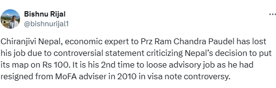 राष्ट्रपतिका सल्लाहकार नेपालले सय रुपैयांको नोटमा चुच्चे नक्सा राख्ने निर्णयलाई असान्दर्भिक र अविवेकी निर्णय भएको आरोप लगाएका थिए । उनले छिमेकिलाई यसमा चिढाउन नहुने अभिव्यक्ति दिएपछि नागरिक अगुवाहरुले समेत संयुक्त वक्तव्य नै जारी गरेर विरोध जनाएका थिए । नेपालको अभिव्यक्तिको सत्तारुढ दलका नेकपा एमालेका अध्यक्ष केपी शर्मा ओलीले समेत विरोध गरेका थिए । उनले राष्ट्रपतिको सल्लाहकारजस्तो व्यक्तिले देशको हितविपरित अभिव्यक्ति दिएको भन्दै उनलाई तुरुन्त पदबाट बर्खास्त गर्न भनेका थिए ।