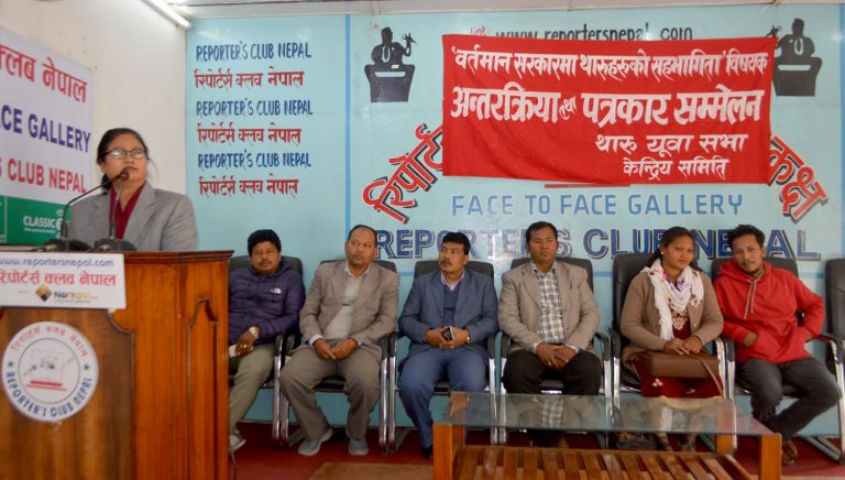 ‘एमाले अध्यक्ष केपी शर्मा ओलीको नेतृत्वमा वाम गठबन्धनको सरकार बनेको छ, तर अहिलेसम्म एक जना पनि थारु मन्त्री बनेका छैनन्, उनले भने, ‘बजारको हल्ला सुन्दा एमाले र माओवादी दुवै पार्टीले थारु समूदायबाट एक जनालाई पनि पूर्ण मन्त्री बनाउनेजस्तो देखिएको छैन, यस्तो अवस्थामा हामी खबरदारी गर्न आज एक्कासी यो क्लबमा भेला भएका छौं।’