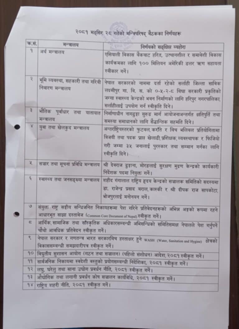 काठमाण्डु – सरकारले गत मंसिर २७ र २८ गते बसेको मन्त्रिपरिषद् बैठकका निर्णय सार्वजनिक गरेको छ ।