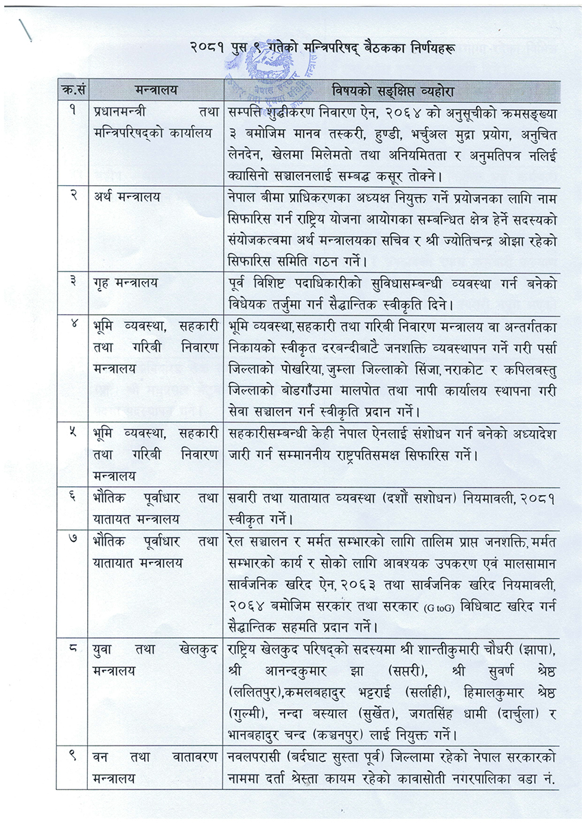 पुस ९ गते मंगलबार बसेको मन्त्रिपरिषद् बैठकका निर्णय बिहीबार सिंहदरबारमा पत्रकार सम्मेलनमार्फत सार्वजनिक गरिएको छ ।
