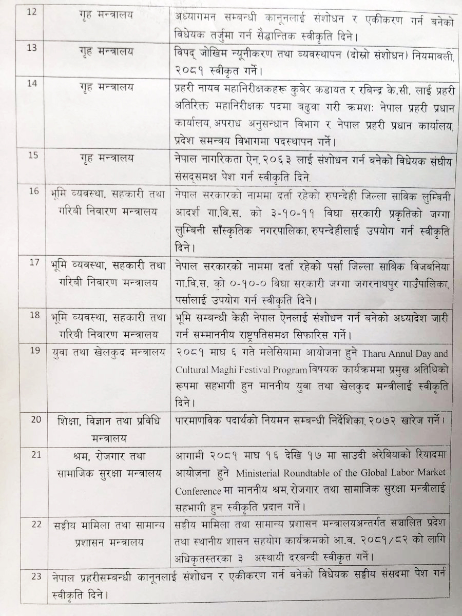 सरकारले भूमि सम्बन्धी केही नेपाल ऐनलाई संशोधन गर्न बनेको अध्यादेश सिफारिस गर्ने, सुशासन प्रबर्धन तथा सार्वजनिक सेवा प्रवाह सम्बन्धी केही नेपाल ऐनलाई संशोधन गर्न बनेको अध्यादेश २०८१ जारी गर्न सिफारिस गर्ने, आर्थिक तथा व्यावसायिक वातावरण सुधार र लगानी अभिवृद्धि सम्बन्धी केही नेपाल ऐनलाई संशोधन गर्न बनेको अध्यादेश २०८१ जारी गर्न सिफारिस गर्ने, आर्थिक कार्यविधि तथा वित्तीय उत्तरदायित्व (पहिलो संशोधन) अध्यादेश २०८१ जारी गर्न सिफारिस गर्ने, निजीकरण ऐन २०५० लाई संशोधन गर्न बनेको अध्यादेश जारी गर्न सिफारिस गर्ने लगायत निर्णय गरेको छ ।