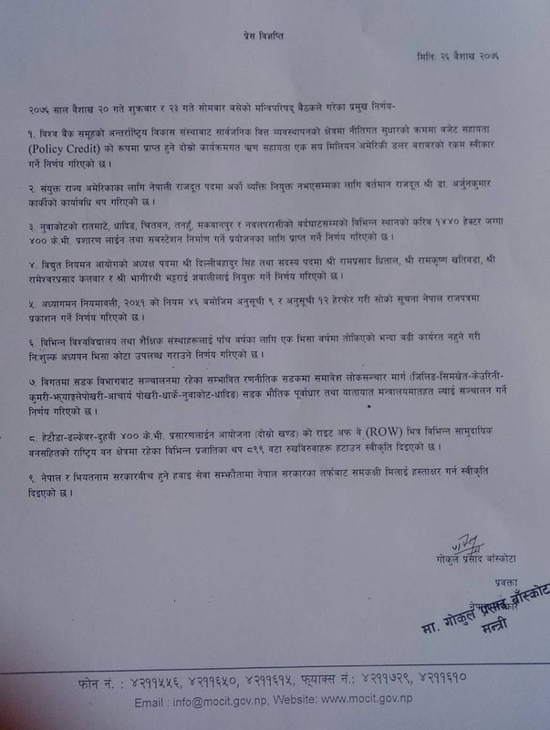 काठमाण्डौं – सरकारले वैशाख २० गते बसेको मन्त्री परिषद बैठकका विभिन्न नौ वटा निर्णयहरु सार्वजनिक गरेको छ ।