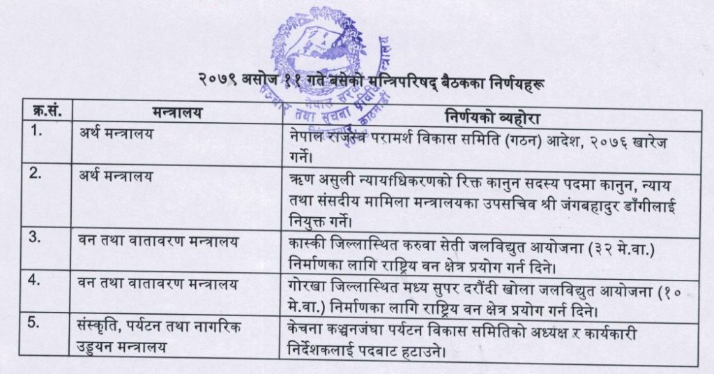 काठमाण्डु – सरकारले मन्त्रिपरिषद बैठकले गरेका निर्णय सार्वजनिक गरेको छ । सरकारका प्रवक्ता ज्ञानेन्द्र कार्कीले मंगलबार बसेको मन्त्रिपरिषद बैठकका निर्णय सार्वजनिक गरेका हुन् ।