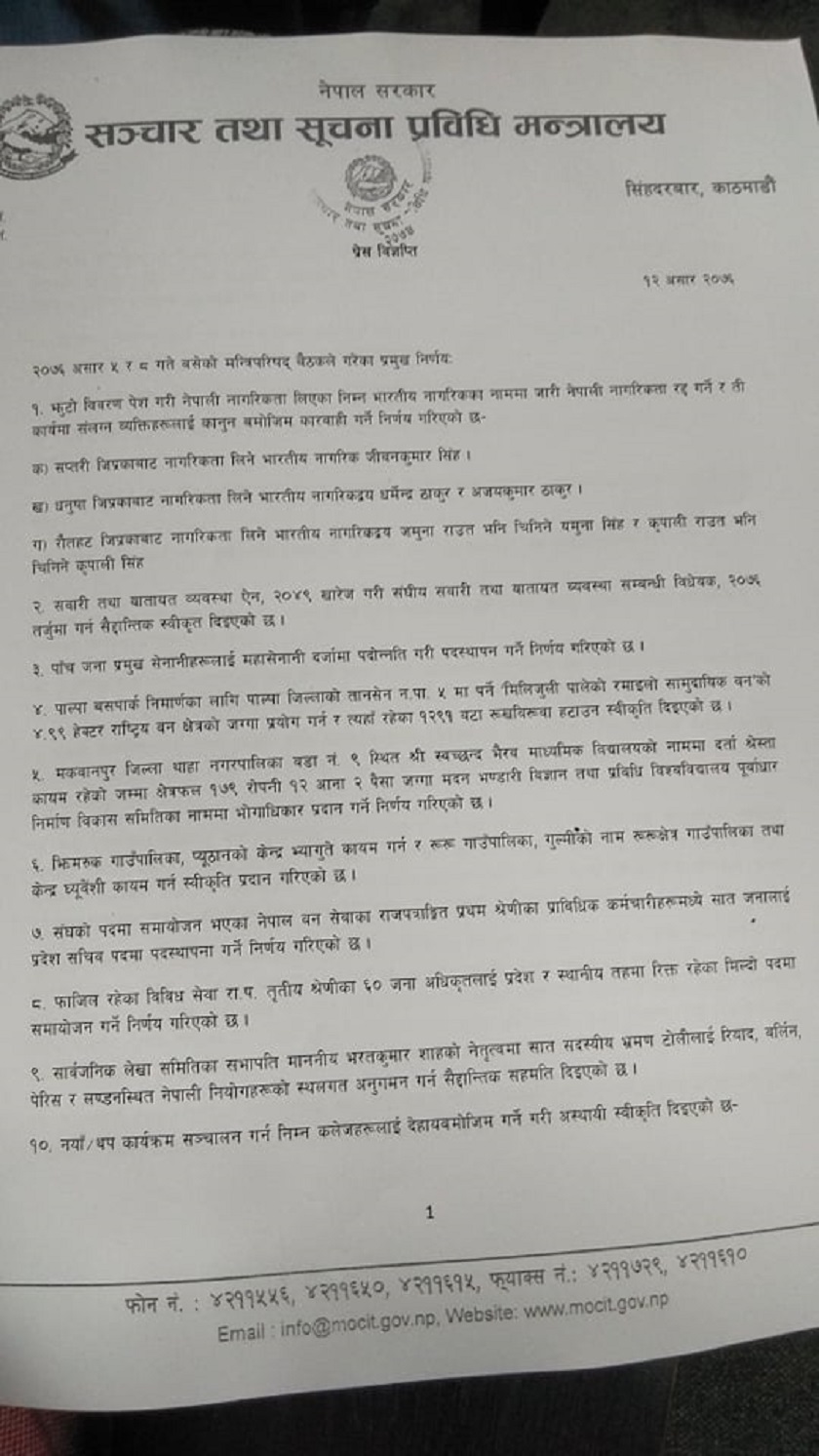 नेपाली नागरिकता लिएका भारतीयहरु जीवनकुमार सिंह, धर्मेन्द्र ठाकुर, अजय राउत, जमुना राउत भनि चिनिने यमुना सिंह र कृपाली राउत भनेर चिनिने कृपाली सिंहको नागरिकता खारेज गर्ने निर्णय मन्त्रिपरिषद्ले गरेको हो ।