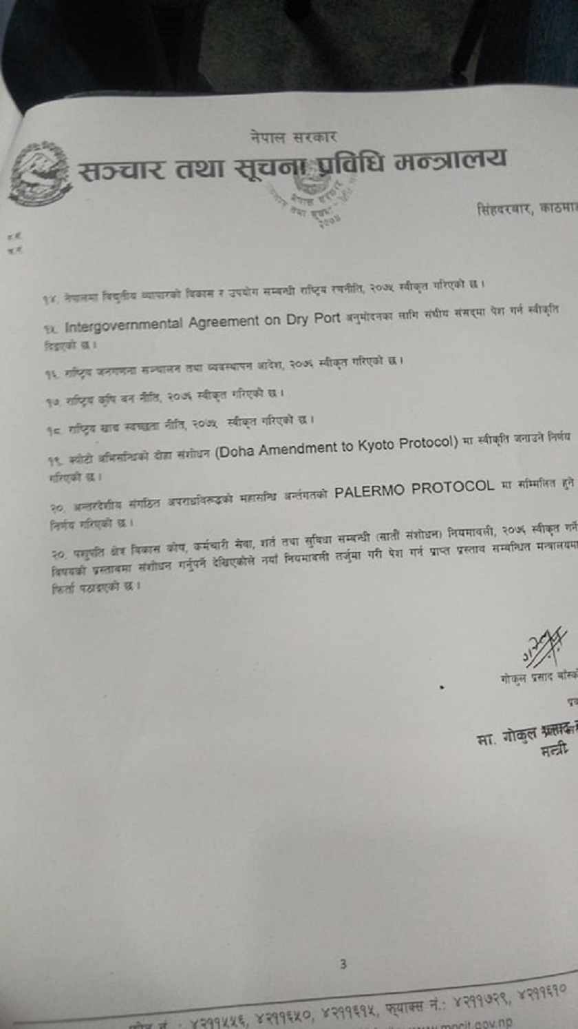 असार ५ र ८ गते बसेका बिहीबार मन्त्रिपरिषद् बैठकको निर्णय सार्वजनिक गर्ने नियमित पत्रकार सम्मेलनमार्फत सरकारका प्रवक्ता एवम् सञ्चार तथा सूचना प्रविधि मन्त्री गोकुल बाँस्कोटाले जानकारी दिए ।
