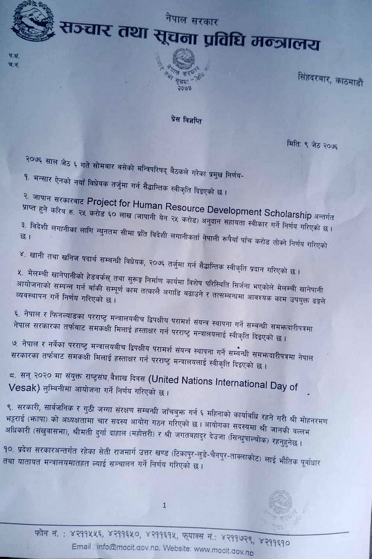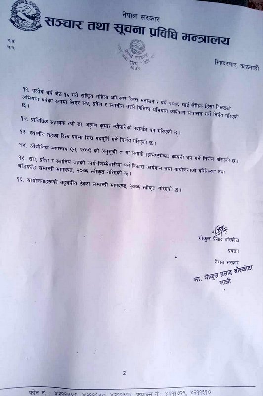 बैठकका निर्णयहरु सरकारका प्रवक्ता गोकुल बाँस्कोटाले बिहीबार पत्रकार सम्मेलन गरेर सार्वजनिक गरेका हुन् ।