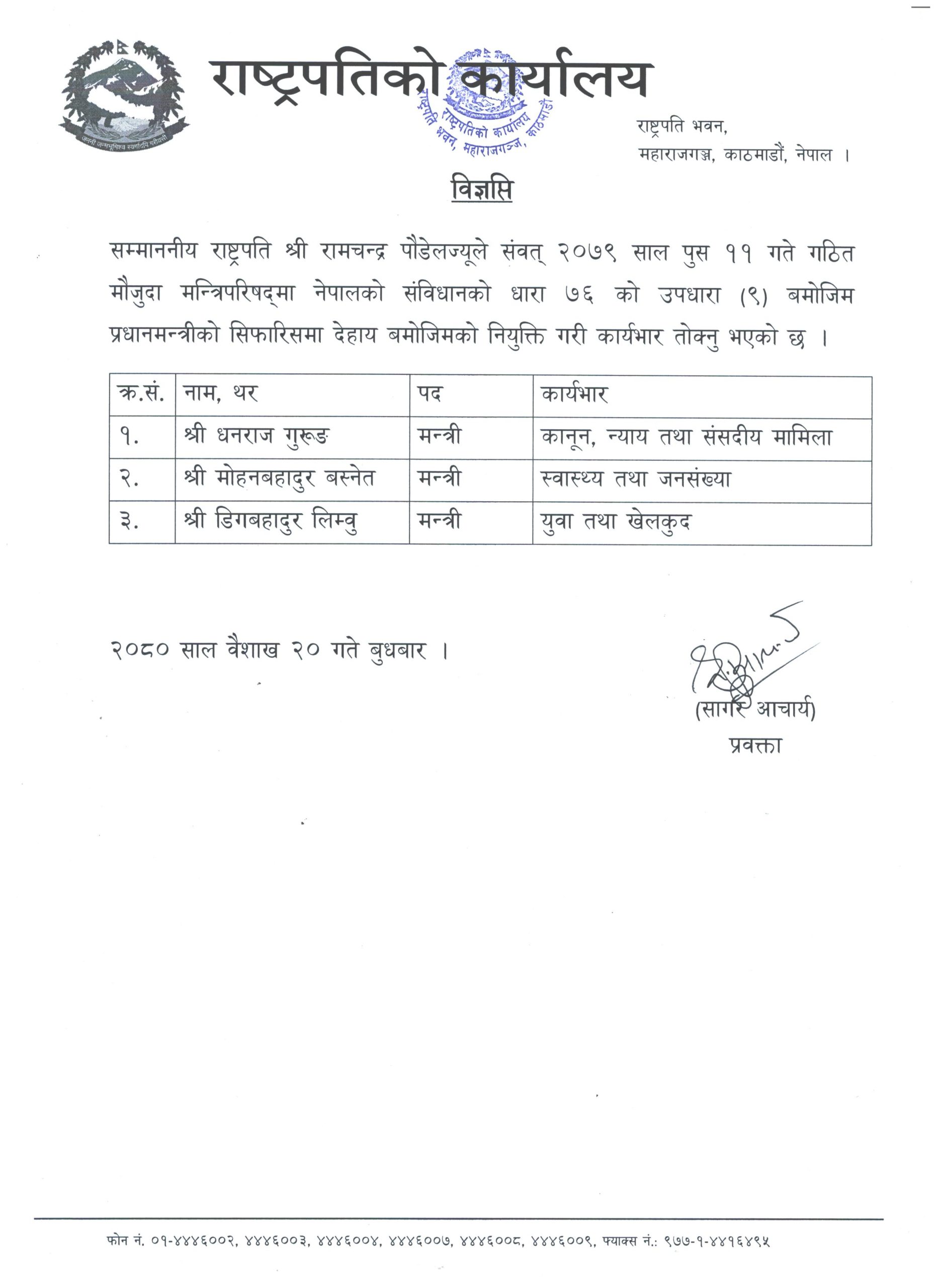 काठमाण्डु – राष्ट्रपति रामचन्द्र पौडेलले तीन जना मन्त्री नियुक्त गरेका छन्। प्रधानमन्त्री दाहाल प्रचण्डको सिफारिसमा राष्ट्रपति रामचन्द्र पौडेलले संविधानको धारा ७६ को उपधारा (९) बमोजिम बुधबार तीन मन्त्रीहरु नियुक्त गरी कार्यभार तोकेका हुन् ।