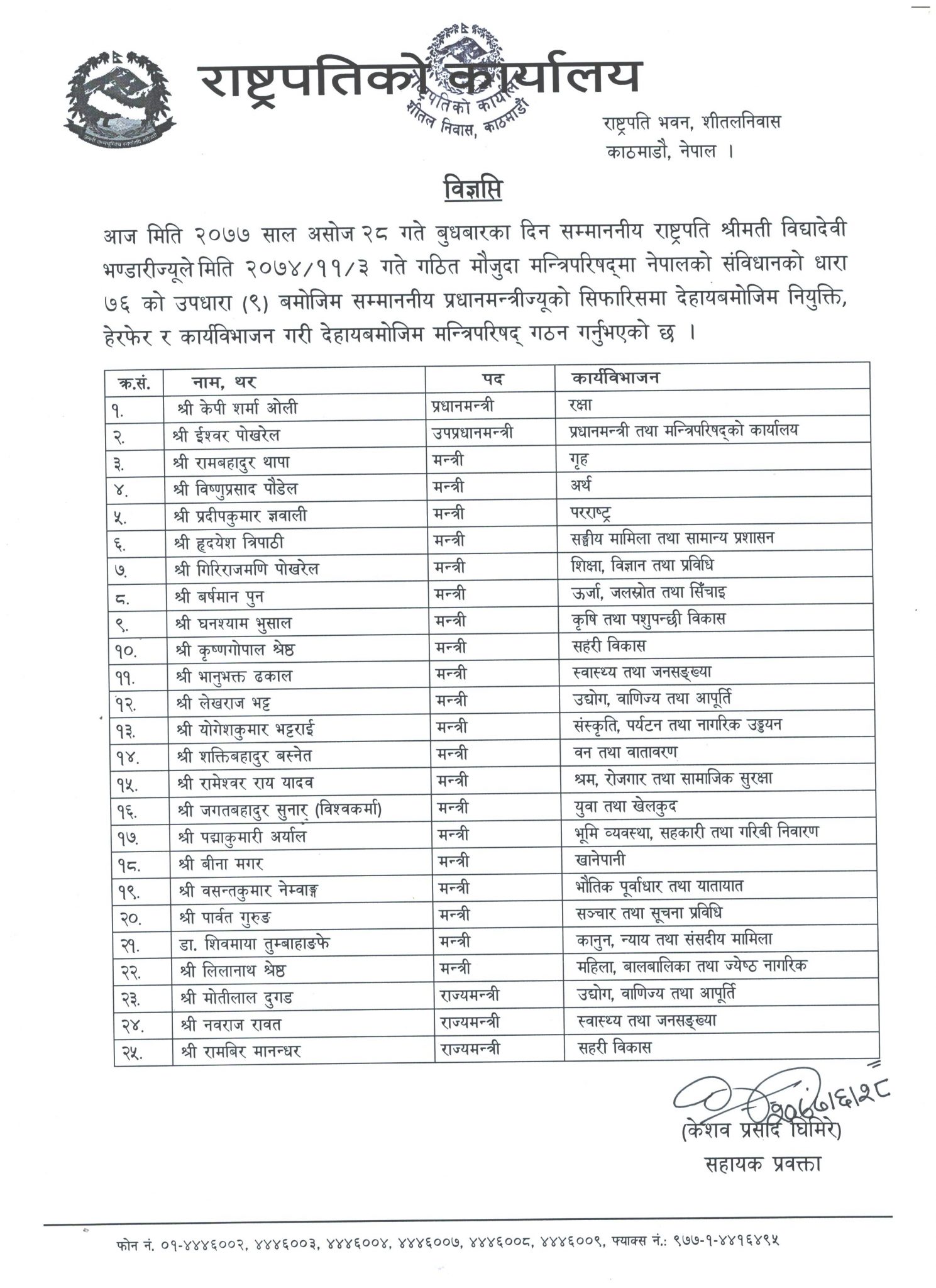 काठमाण्डु -प्रधानमन्त्री केपी शर्मा ओलीले मन्त्रिपरिषद विस्तार गरेका छन् । उनले केही मन्त्रीहरुको जिम्मेवारी समेत हेरफेर गरेका छन् । प्रधानमन्त्री ओलीले बुधवार गरेको मन्त्रिपरिषद विस्तार तिनै जना आफु निकट नेताहरुलाई मन्त्री नियुक्त गरेका हुन् । प्रधानमन्त्री ओलीले अर्थमन्त्रीमा विष्णु पौडेल, महिला बालबालिका मन्त्रीमा लीलानाथ श्रेष्ठ र शहरी विकासमन्त्री कृष्णगोपाल श्रेष्ठलाई नियुक्त गरेका छन् ।