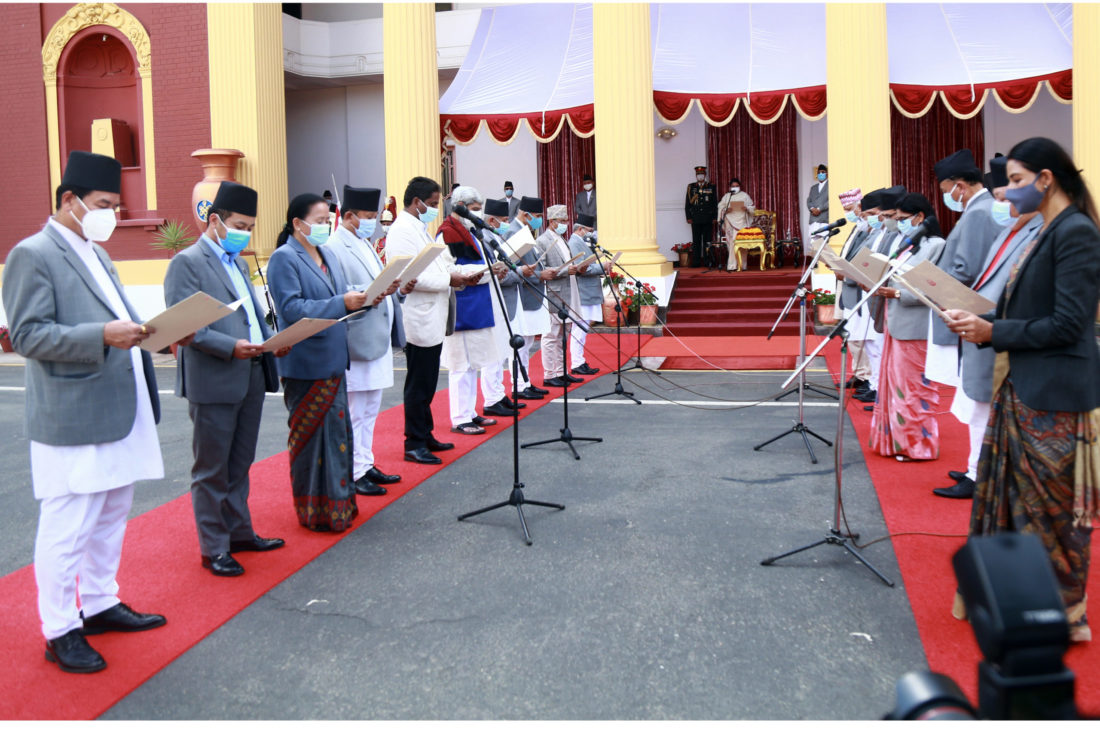शपथ गर्नेहरुमा ईश्वर पोखरेल, रामबहादुर थापा बादल, टोप बहादुर रायमाझी, विष्णु पौडेल, प्रदीप ज्ञवाली, हृदेश त्रिपाठी, लेखराज भट्ट, प्रभु शाह, मणि थापा, गौरीशंकर चौधरी, कृष्णगोपाल श्रेष्ठ, बसन्तकुमार नेम्वाङ, पार्वत गुरुङ, लिलानाथ श्रेष्ठ, गणेशसिंह ठगुन्ना, प्रेमबहादुर आले, जुलीकुमारी महतो, दावा लामा तामाङ्ग, शिवमाया तुम्वाहाम्फे, पद्मा अर्याल रहेका छन् । त्यस्तै राज्यमन्त्रीमा नरवाज रावत, रामवीर मानन्धर र विमला विक रहेका छन् ।