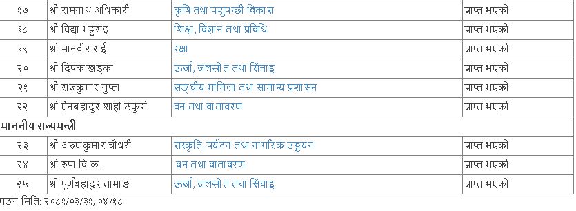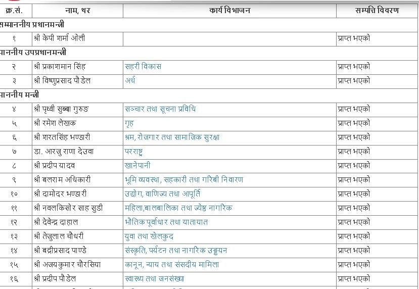 प्रधानमन्त्री तथा मन्त्रिपरिषद्को कार्यालयको वेबसाइटमा मन्त्रीहरूको सम्पति विवरण ‘प्राप्त भएको’ उल्लेख छ । प्रधानमन्त्री र मन्त्रीदेखि राज्यमन्त्रीसम्मले सम्पत्ति विवरण बुझाइसके पिन सार्वजनिक गरिएको छैन ।