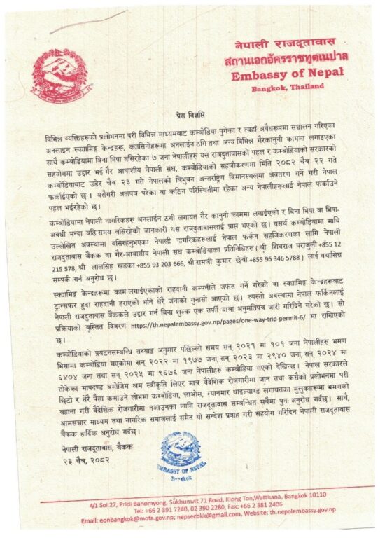 कसैको प्रलोभनमा परी छिटो र धेरै पैसा कमाउने लोभमा भ्रमणको बहाना बनाएर कम्बोडिया, लाओस, म्यानमार र थाइल्यान्ड जस्ता देशमा रोजगारीको खोजीमा नआउन राजदूतावासले अपिल गरेको छ ।