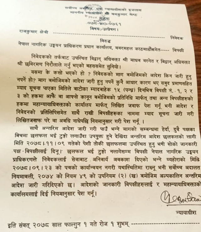 काठमाण्डु– नेपाल नागरिक उड्डयन प्राधिकरणका महानिर्देशक राजकुमार क्षेत्रीलाई अनिवार्य अवकाश दिने निर्णय कार्यन्वयन नगर्न सर्वोच्च अदालतले अल्पकालीन आदेश दिएको छ । न्यायाधीश बमकुमार श्रेष्ठको एकल इजलासले आइतवार छलफलको टुंगो नलागेसम्म क्षेत्रीलाई अवकाश नदिन अल्पकालिन अन्तरिम आदेश दिएको हो ।