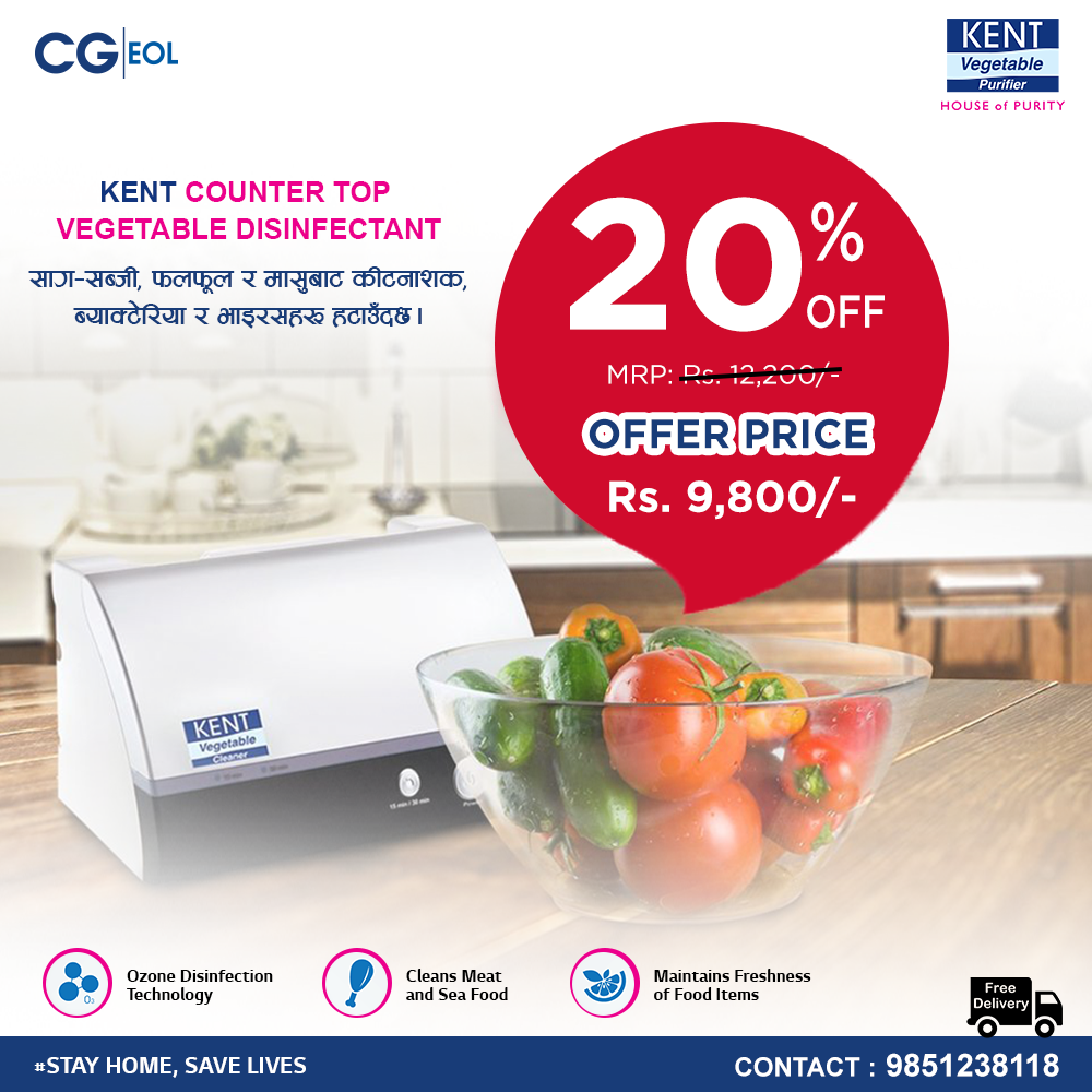 काठमाडौं – ईओएल प्रालि नेपालमा केन्ट उत्पादनहरूका लागि एक मात्रआधिकारिक वितरक, सि. जी. इलेक्ट्रोनिक्स अन्तर्गतको संस्थाले केन्ट काउन्टर टप भेजिटेबल कीटाणुनाशक उपकरणमा २० प्रतिशत छुटको साथआएको छ ।