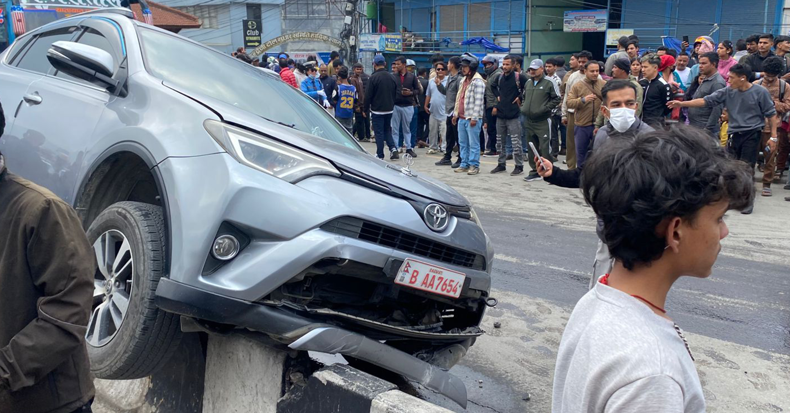 दुर्घटनाका कारण कारको अगाडिपट्टिको भागमा क्षति पुगेको छ । कार तीव्र गतिमा आएर डिभाइडरमा हानेको र लेन मिचेर भाग्न खोजेपछि भीडले घेरेर रोकेको थियो ।