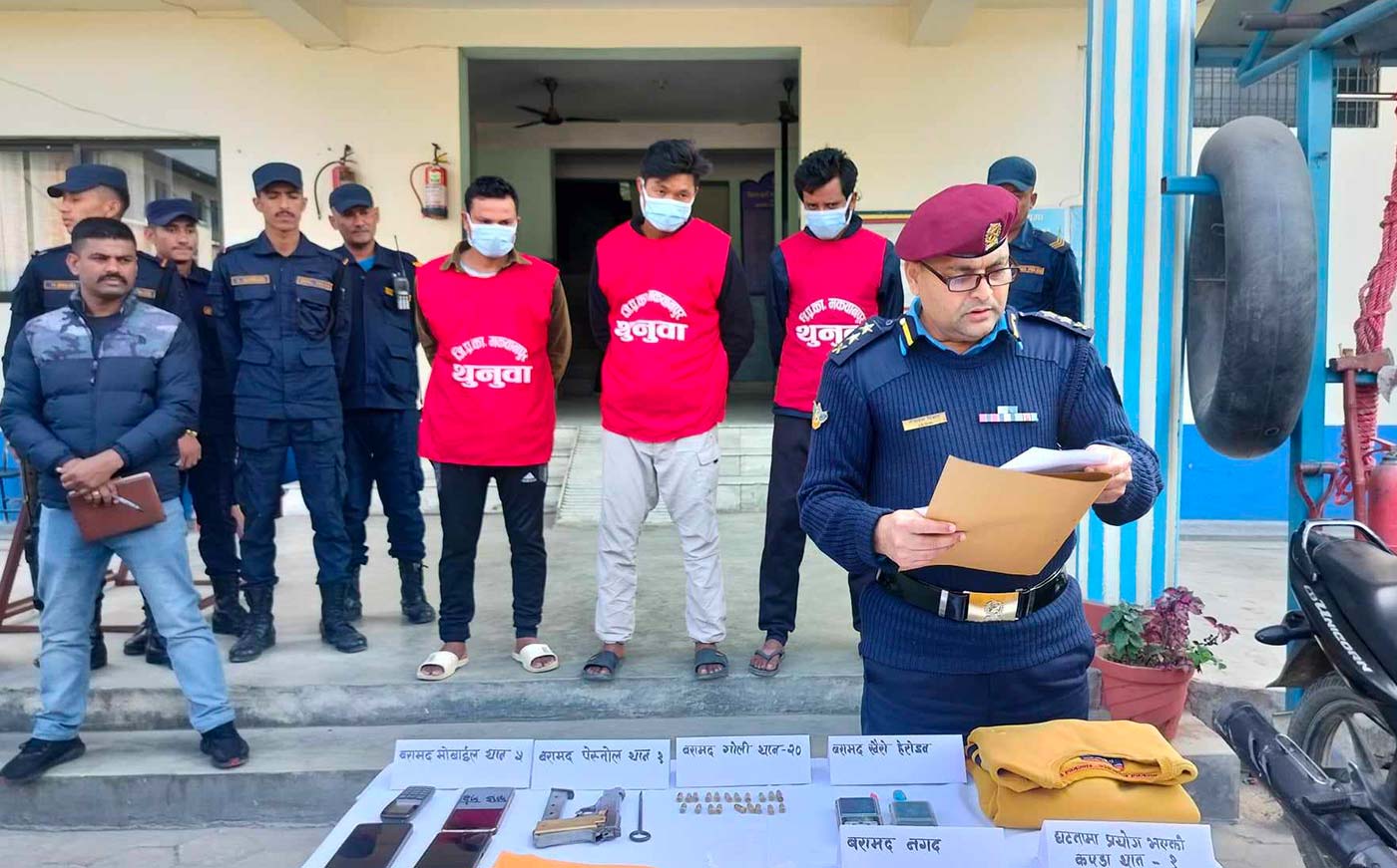 हेटौंडा – ठूलोबुवासँग पैसा माग्ने उद्देश्यले घरमा गोली प्रहार गर्नेसहित ३ जनालाई मकवानपुर प्रहरीले पक्राउ गरेर सार्वजनिक गरेको छ । पक्राउ पर्नेमा हेटौंडा उपमहानगरपालिका–९ बस्ने ३३ वर्षका निश्चल पौडेल, ३५ वर्षीय गणेश घले र ३० वर्षीय प्रितम क्षेत्री रहेका छन् । पक्राउ परेका निश्चल पौडेलले पैसा असुल्ने उद्देश्यले आफ्नै ठूलोबुवा हेटौंडा उपमहानगरपालिका–९ बस्ने सूर्यप्रसाद श्रेष्ठको…