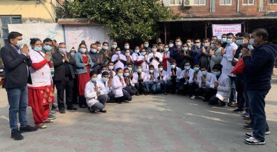 सप्तरी – सप्तरीको सिमावर्ती क्षेत्र तिलाठी कोइलाडी गाउँपालिका–१ तिलाठीमा नेपाली सेनाले सञ्चालन गरेको निःशुल्क स्वास्थ्य शिविरमा स्वास्थ्य उपचार गराउँदै स्थानीयवासी । तस्बिर : नानीमैया कटवाल/रासस