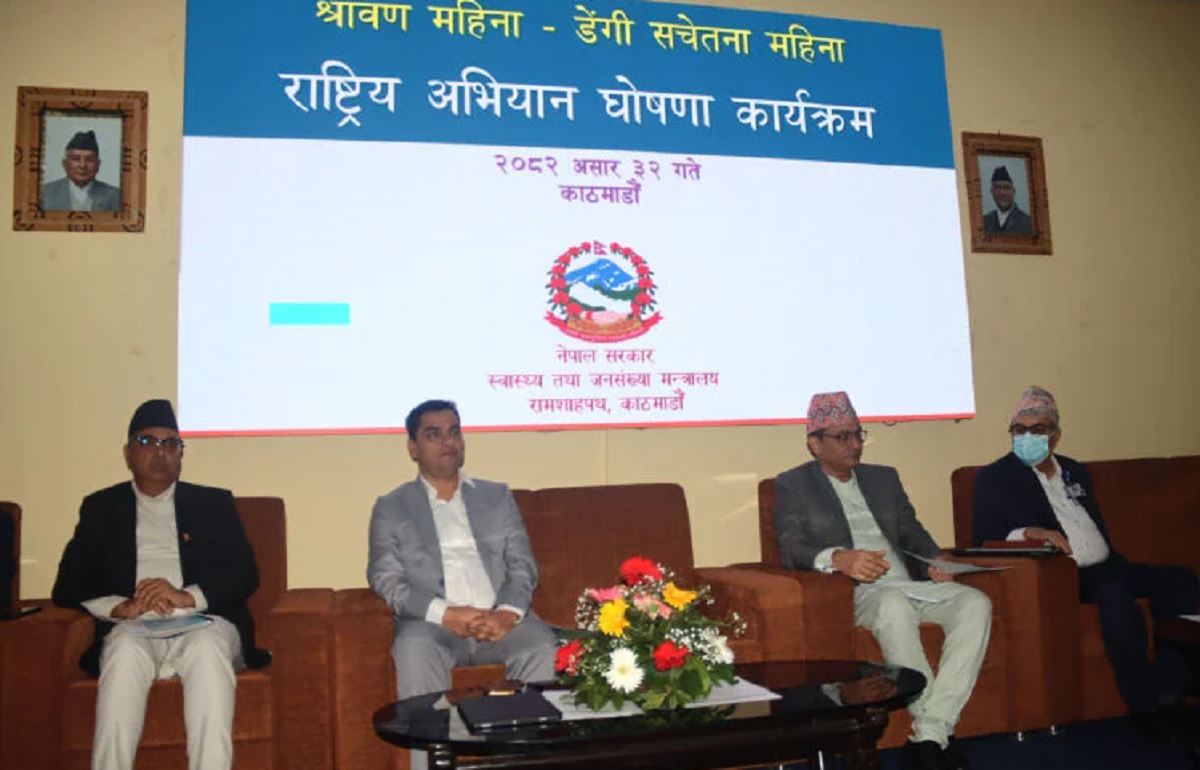 काठमाण्डु- राष्ट्रिय डेङ्गी सचेतना अभियान बिहीबारदेखि सुरु भएको छ । सरकारले साउन महिनाभर राष्ट्रिय डेङ्गी सचेतना अभियान सञ्चालन गर्नेछ । लामखुट्टेको नियन्त्रण र टोकाइबाट बच्ने उपायबारे सचेतना बढाउने लक्ष्यसहित सरकारले साउन महिनाभर अभियान सञ्चालन गर्ने घोषणा गरेको हो । स्वास्थ्य सेवा विभागको इपिडिमोलोजी तथा रोग नियन्त्रण महाशाखाका अनुसार तीनै तहका सरकार सबै मन्त्रालय, सांसदको सहभागिता…