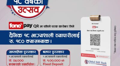 काठमाण्डु– साताको पहिलो कारोबारको दिन सेयरबजार उकालो लागेको छ । नेप्से ५.३२ अंकले बढ्दा परिसुचक २५९१.५६ विन्दुमा पुगेको हो। आइतबार ९३ लाख ८६ हजार कित्ता सेयर बिक्री हुदा ४ अर्ब ८६ करोडको कारोबार भएको छ। कारोबारमा आएका १४१ कम्पनीको सेयर मूल्य बढ्दा ९४ वटा घटेका छन् भने ८ वटाको मूल्य स्थिर रहेको छ । कारोबार…