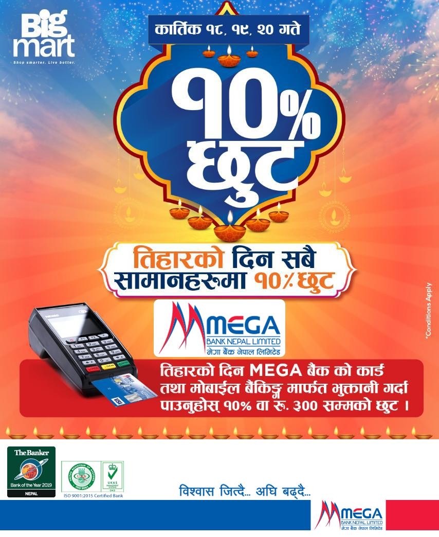 काठमाण्डु – मेगा बैंक नेपाल लिमिटेडले ग्राहकहरुलाई तिहारमा विशेष अफर ल्याएको छ । डिजिटल कारोबारलाई प्रोत्साहन गर्ने उद्देश्यले मेगा बैंकले तिहारमा उपहार स्वरुप 'इ–तिहार क्याम्पियन” र “मेगा मार्ट क्याम्पियन' ल्याएको हो । 'इ–तिहार क्याम्पियन' भाइटिकाको दिनलाई लक्षित गरी ल्याइएको हो । भाइटिकामा दक्षिणा दिँदा १५ प्रतिशत अर्थात ५०० रुपैंयासम्म क्यासब्याक पाइने भएको छ । यसका…