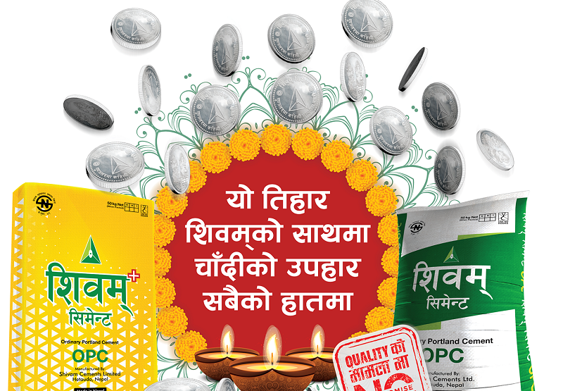 काठमाडौं– शिवम् सिमेन्ट्सले ग्राहकलाई दीपावलीको शुभकामना व्यक्त गर्दै ‘यो तिहार शिवम्को साथमा, चाँदीको उपहार सबैको हातमा ’ नामक बिक्री योजना बजारमा ल्याएको छ । यस योजनाअन्तर्गत प्रत्येक २५ बोरा शिवम् सिमेन्टको खरिदमा १० ग्राम चाँदीको सिक्का, ५० बोरा शिवम् सिमेन्टको खरिदमा २२ ग्राम चाँदीको दियो र १०० बोरा शिवम् सिमेन्टको खरिदमा ५० ग्राम चाँदीको दियो…