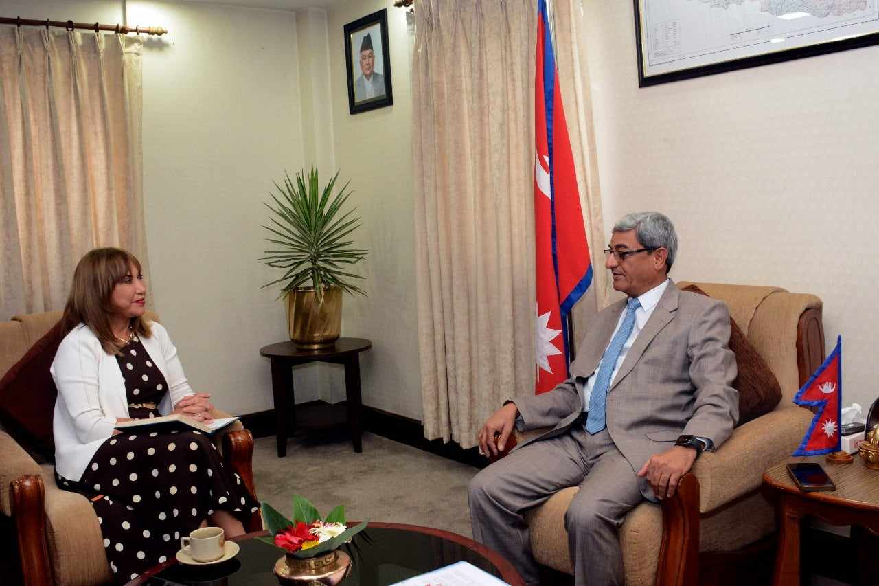 काठमाण्डु– गृहमन्त्री रमेश लेखकसँग संयुक्त राष्ट्रसङ्घीय आवासीय संयोजक हाना सिंगर हाम्डीले आज शिष्टाचार भेट गरेका छन् । सिंहदरबारस्थित गृह मन्त्रालयमा भएको उक्त द्विपक्षीय भेटवातार्मा गृहमन्त्री लेखकले संयुक्त राष्ट्रसङघको भूमिकाको प्रसंशा गरे । सो अवसरमा उनले संयुक्त राष्ट्रसङ्घीय शान्ति मिसनमा नेपाली सेना र नेपाल प्रहरीको भूमिकाको प्रसंशा गर्दै शान्ति मिसनमा नेपाली सेना, नेपाल प्रहरी र सशस्त्र…