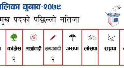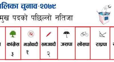 चितवन - भरतपुर महानगरपालिकामा एमालेका उम्मेदवार विजयी सुवेदीले अग्रता लिएका छन् । भरतपुर महानगरपालिका–१ मा १५० मत गन्दा उनले अग्रता लिएका हुन् । मेयरमा विजय सुवेदी (एमाले) : ६६ रेनु दाहाल (माओवादी) : ५१ जगन्नाथ पौडेल (स्वतन्त्र) : १३ उपमेयरमा चित्रसेन अधिकारी (काङ्ग्रेस) : ५७ हिमला गुरुङ्ग (राप्रपा) : ४५ वडा अध्यक्षमा शुक्र श्रेष्ठ (एमाले)…