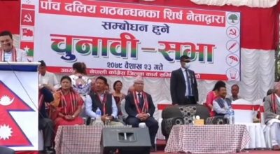 काठमाण्डु – नेपाली कांग्रेसको तर्फबाट काठमाण्डु महानगरपालिकामा मेयर पदकी उम्मेदवार सिर्जना सिंहले असुरक्षित रहेको काठमाण्डुलाई सुरक्षित बनाउनु आफ्नो पहिलो प्राथमिकता रहेको बताएकी छिन् । रत्नपार्कस्थित शान्तिबाटिकामा आयोजित पाँच दलीय गठबन्धनको चुनावी सभालाई सम्बोधन गर्दै सिंहले असुरक्षित रहेको काठमाण्डुलाई सुरक्षित बनाएर ढुक्कले बस्न सक्ने वातावरण बनाउनु पहिलो प्राथमिकता रहेको बताएकी हुन् । काठमाण्डु महानगरमा फोहोरको समस्या,…