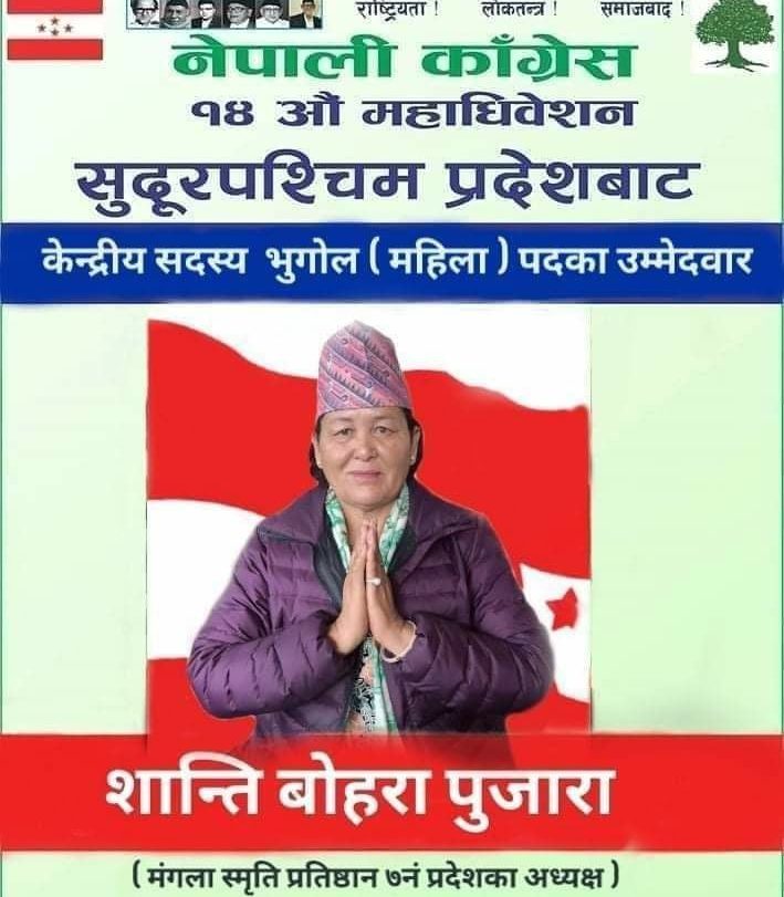 काठमाण्डु – नेपाली कांग्रेसकी नेतृ शान्ति बोहरा पुजाराले केन्द्रीय सदस्य पदमा उम्मेदवारी घोषणा गरेकी छन् । भोलीदेखि काठमाण्डुमा सुरु हुने १४औं महाधिवेशनमा बोहराले सुदूरपश्चिम प्रदेशबाट केन्द्रीय सदस्यमा भूगोल (महिला) तर्फबाट उम्मेदवारी घोषणा गरेकी हुन् । मंगला स्मृति प्रतिष्ठान ७ नम्बर प्रदेशको अध्यक्ष समेत रहेकी उनले आफूले पार्टीमा आवद्ध रहेर देश र जनताका लागि लामो समयदेखि…