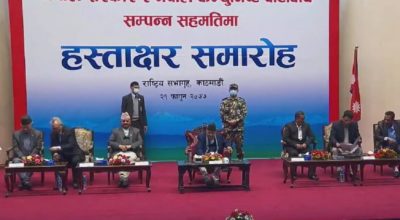 काठमाण्डु – प्रधानमन्त्री केपी शर्मा ओलीले नेपालमा हिंसात्मक आन्दोलन अन्त्य भएको बताएका छन् । सरकार र नेकपा विप्लव समूहबीच भएको सहमति पत्रमा हस्ताक्षर गर्दै ओलीले शान्तिपूर्ण वातावरणमा अघि बढेको बताएका छन् । ‘अब नेपालमा हिंसात्मक बाटो छैन । हिंसात्मक कार्यदिशा कसैले पनि लिएर हिँडेको छैन,’ उनले भने, ‘अमेरिका, चीन, भारत भन्दा नेपाल शान्तीको मापदण्डमा अघि…