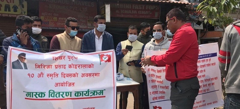 काठमाडौं – नेपाली काँग्रेसका पूर्वसभापति एवं पूर्वप्रधानमन्त्री गिरिजाप्रसाद कोइरालाको १० औँ स्मृति दिवसका अवसरमा माक्स र स्यानेटाइजर वितरण गरिएको छ । नेपाल विद्यार्थी सङ्घ स्याङ्जा–काठमाडौँ सम्पर्क समितिले आज नयाँ बानेश्वर चोकमा दुई हजार ५०० माक्स र ५० स्यानेटाइजर वितरण गरेको हो । कार्यक्रममा नेपाल विद्यार्थी सङ्घका महामन्त्री बलदेव तिमल्सेनाले विश्वव्यापीरुपमा फैलँदै गएको कोरोना भाइरसबारे नेविसङ्घले…