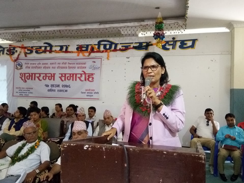 स्याङ्जा - भूमि व्यवस्था सहकारी तथा गरिबी निवारण मन्त्री पद्माकुमारी अर्यालले जनताको घरदैलोमा पुगेर नै गरिबीको पहिचान गरिने बताएकी छिन्। भूमि व्यवस्था सहकारी तथा गरिबी निवारण मन्त्रालयकाे गरिब घरपरिवार तथा वितरण अन्तर्गत दोस्रो चरणको कार्यक्रमको सुभारम्भ गर्दै मन्त्री अर्यालले खास गरिबीको पहिचान जनताको घरदैलोमा नै पुगेर गरिने बताएकी हुन्। 'कुनै चौतारोमा बसेर होइन जनताको घरदैलोमा…